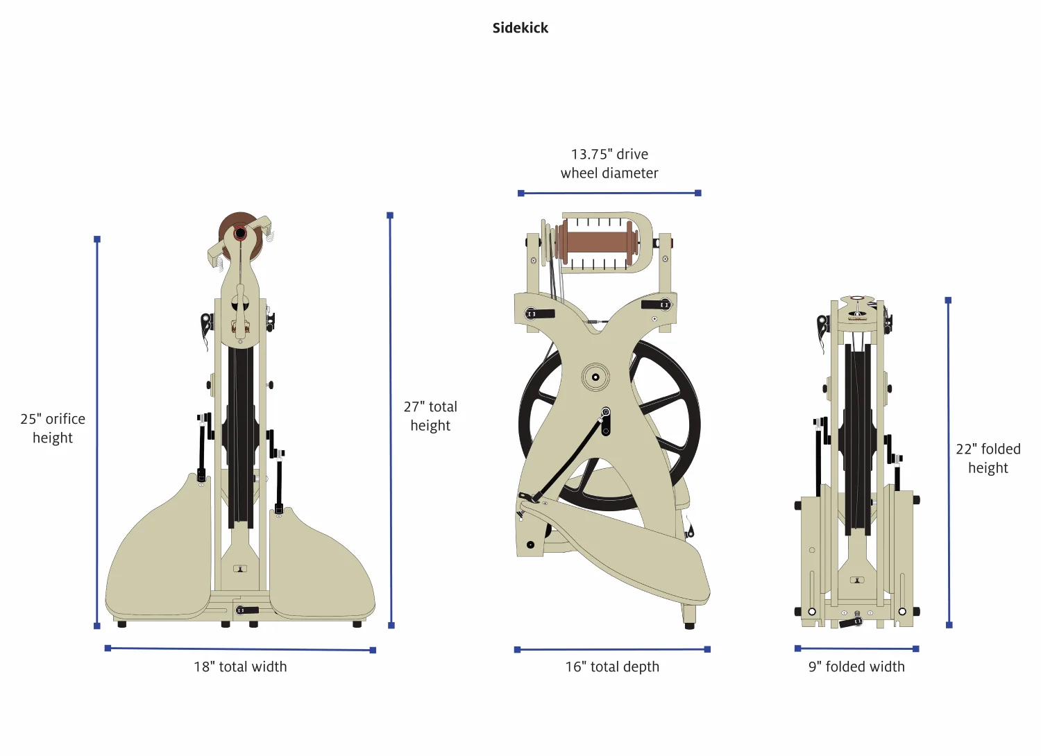 Our travel wheel includes full-size treadles, folding front and rear maidens, on-board storage for whorls and a bobbin, and flyer storage under the left treadle. Quick release levers make the Sidekick easy to fold and unfold.